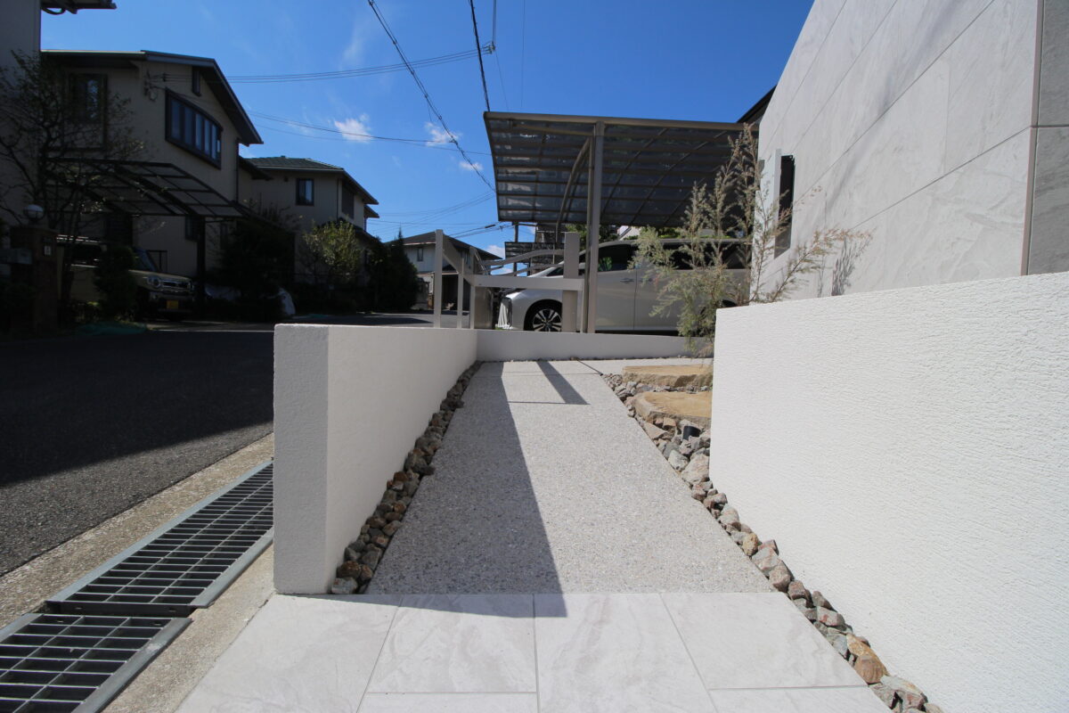 ホワイトベースのタイルを使用して高級感を 足元に自然石のステップを採用しています