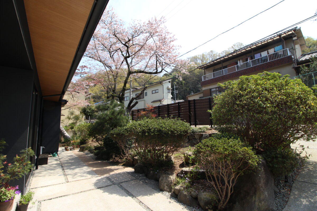 桜の根を傷めないように注意しながら、庭全体のバランスを考慮しました
