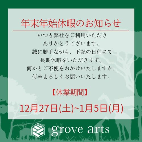 【年末年始休暇のお知らせ】 平素は格別のお引き立て賜わり厚くお礼申し上げます。 弊社の年末年始休暇についてお知らせいたします。 誠に勝手ながら12/27(土)〜1/5(月)の日程におきまして休暇をいただきます。 皆様にはご迷惑をおかけいたしますが、何卒よろしくお願い申し上げます。 休み期間中のお問い合わせに関しましては1/6以降に順次確認し、担当者より折り返しご連絡いたします。 尚、お問い合わせはホームページからのメール、LINE、留守番電話の自動返信メッセージにて受付しております。 担当者からのご連絡は1/6以降となります。 ご了承くださいませ。 折り返しにお時間いただく場合がございますが、何卒よろしくお願いいたします。