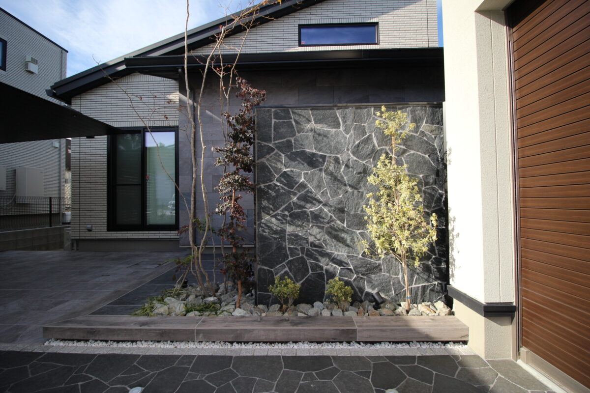 1つ目は「モノトーンカラーを基調とした、おしゃれな外構にしたい」という点。そこで、門まわりやアプローチ、駐車スペースなど外構全体のデザインには、ブラックやグレージュといった落ち着いたカラーを中心に使用。統一感のあるエクステリアが、建物全体の印象をさらに引き締めています。