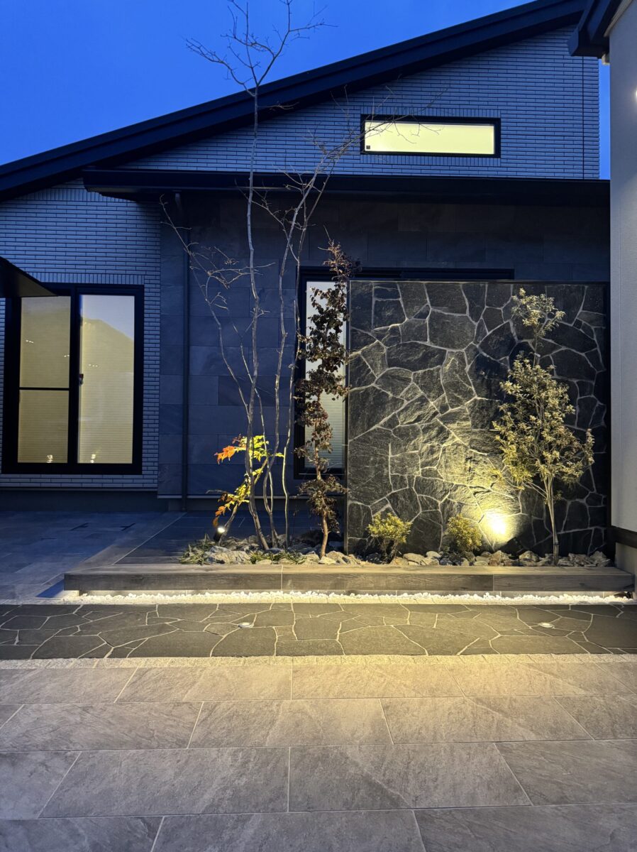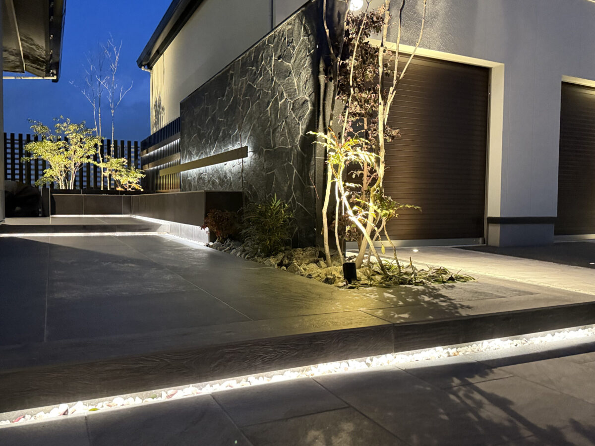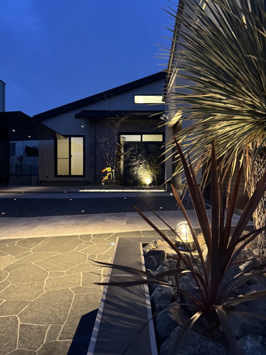 柔らかな光が外構全体に広がり、日没後も温かみのあるエクステリア空間が広がります。照明は防犯性を高めるだけでなく、デザイン性や居心地の良さも向上させています。