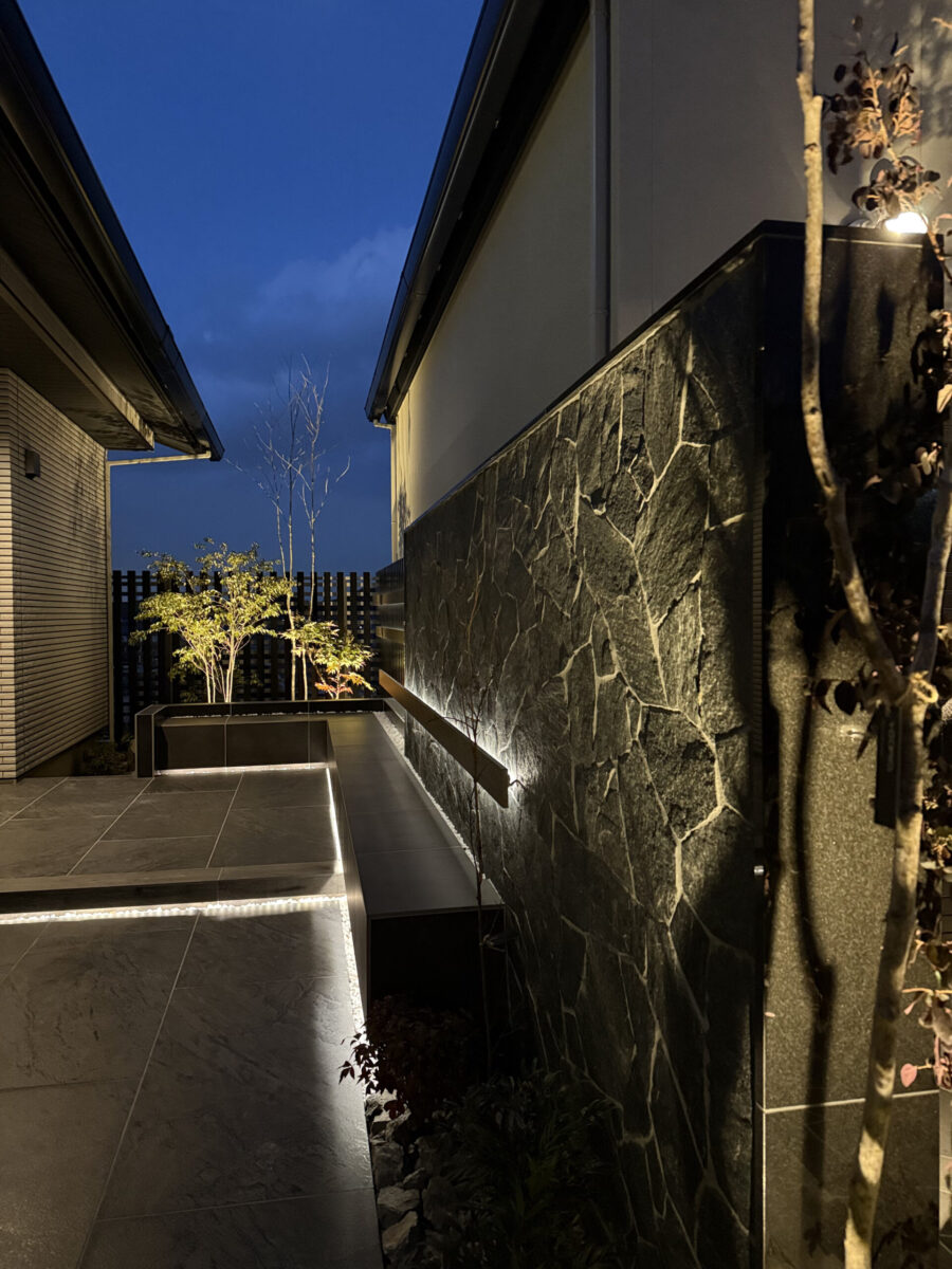 階段まわりや石張りの塀にライン照明や間接照明を配置し、夜間でも美しく映える庭空間を演出。