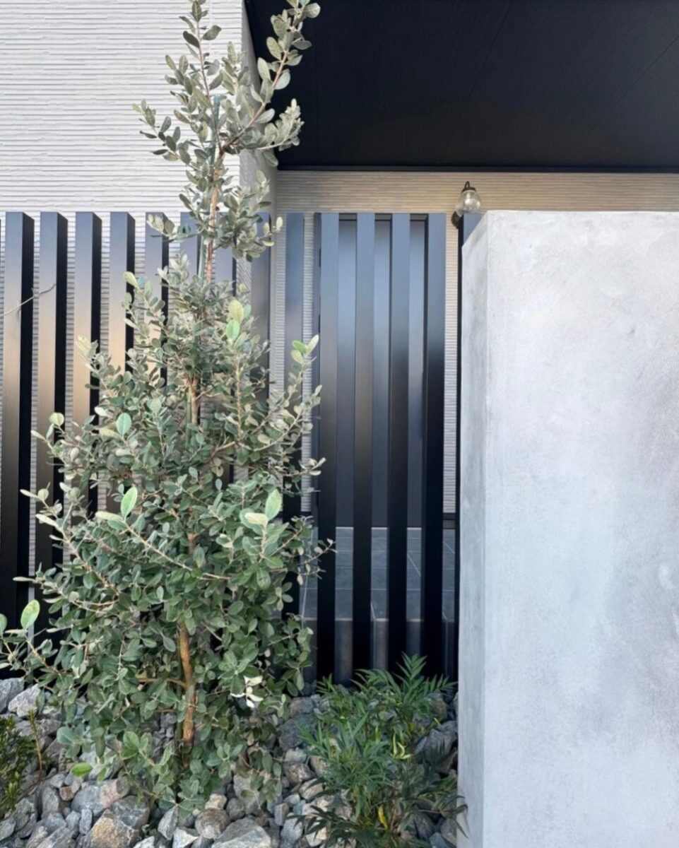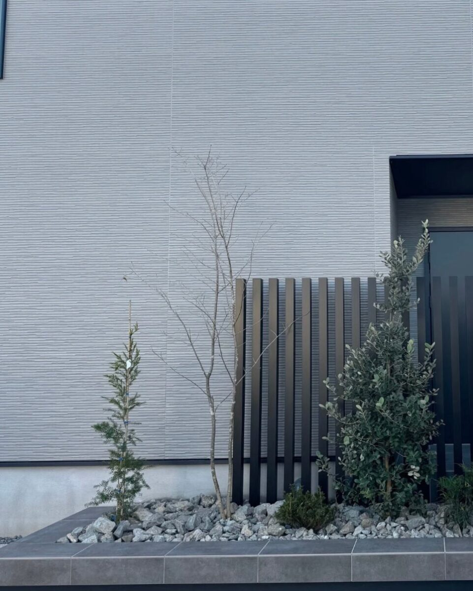 この縦格子はブラックカラーを採用しており、アッシュグレーとの相性がよく、外構全体にメリハリと引き締まった印象を与えています。