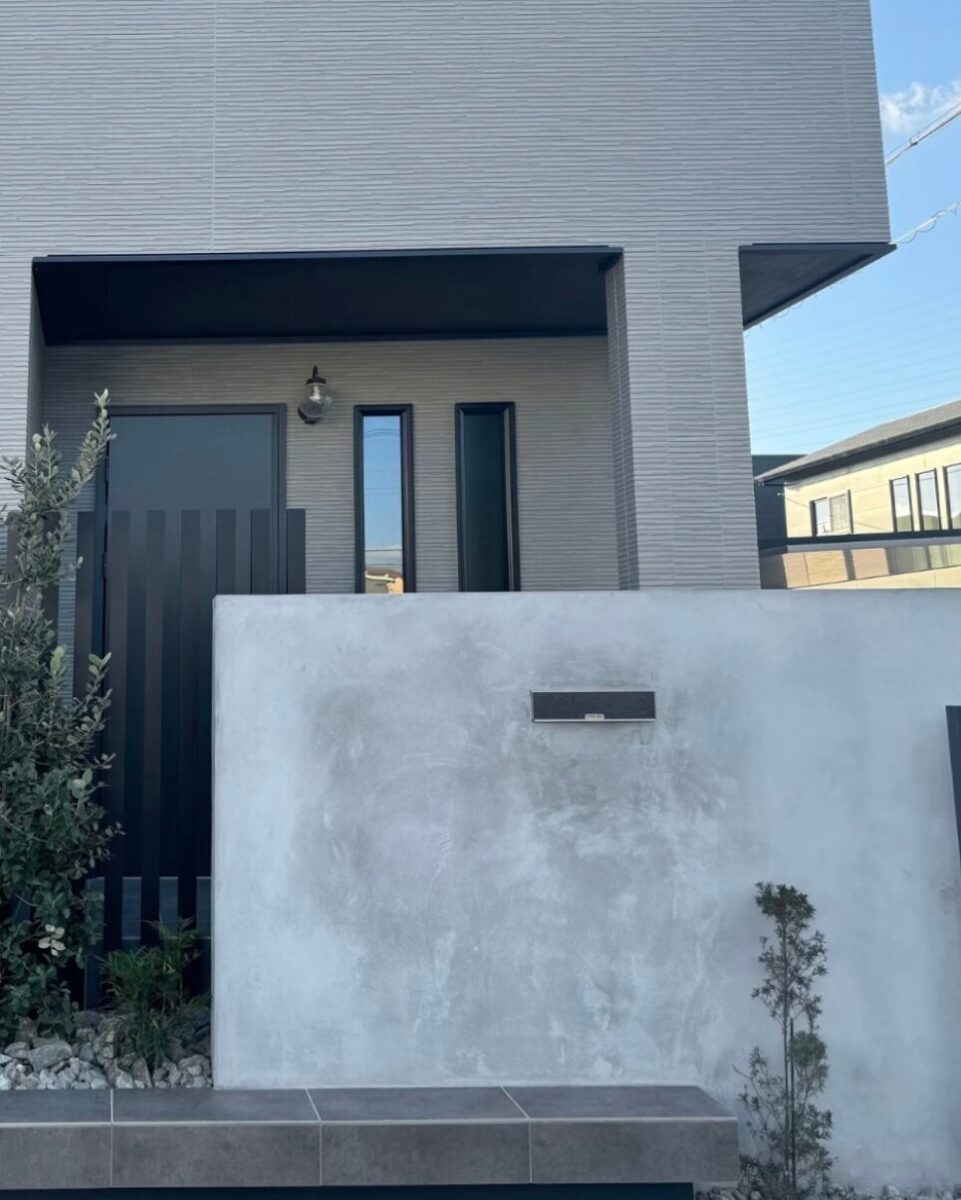 まず建物の外壁カラーが落ち着いたアッシュグレーだったため、外構の主役となる門袖壁には、外壁と同系色であるモルタル仕上げを採用しました。