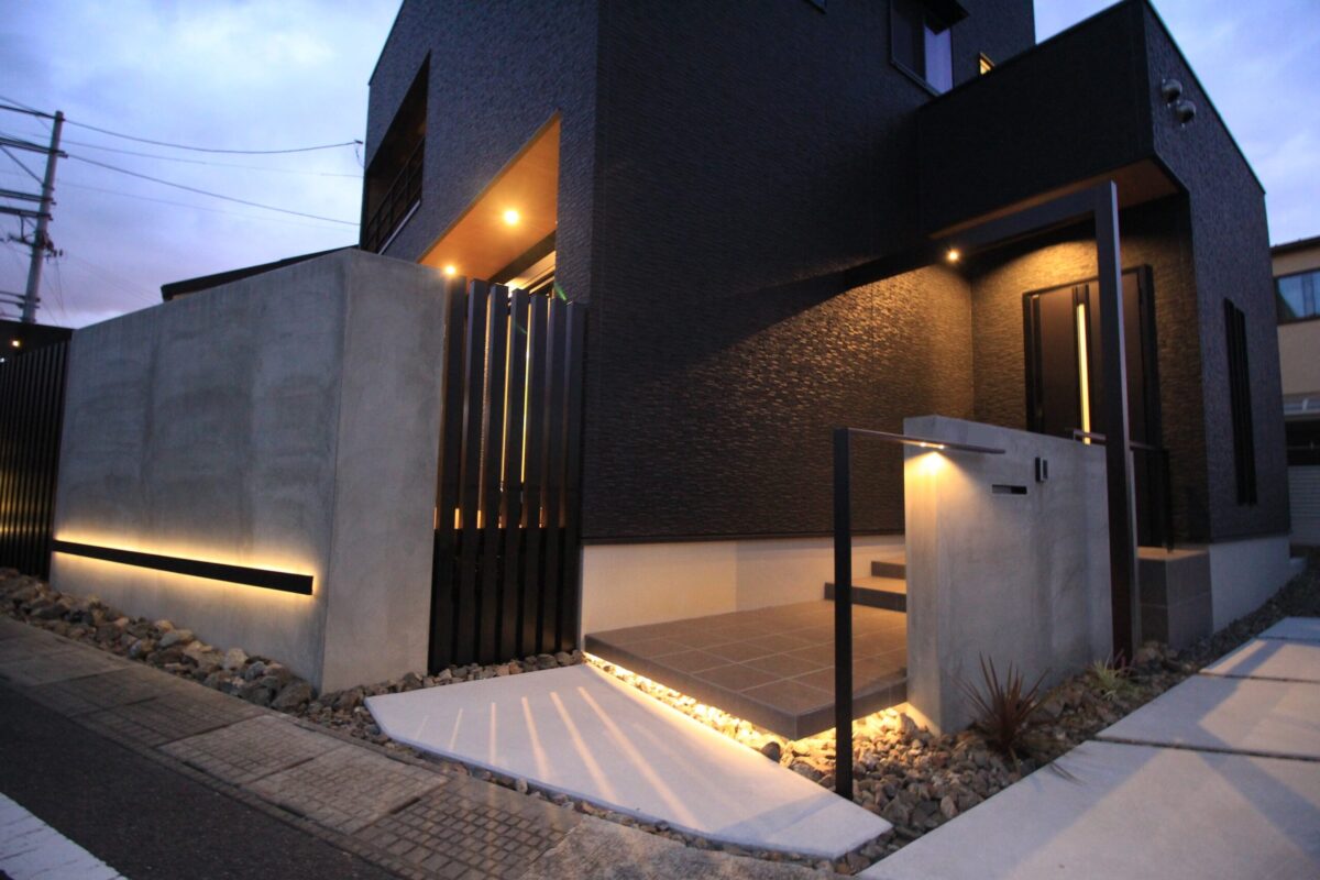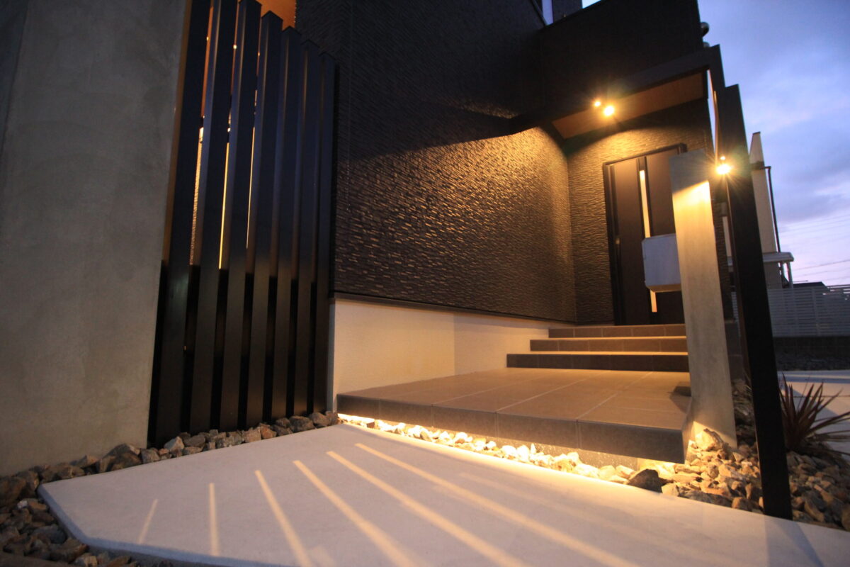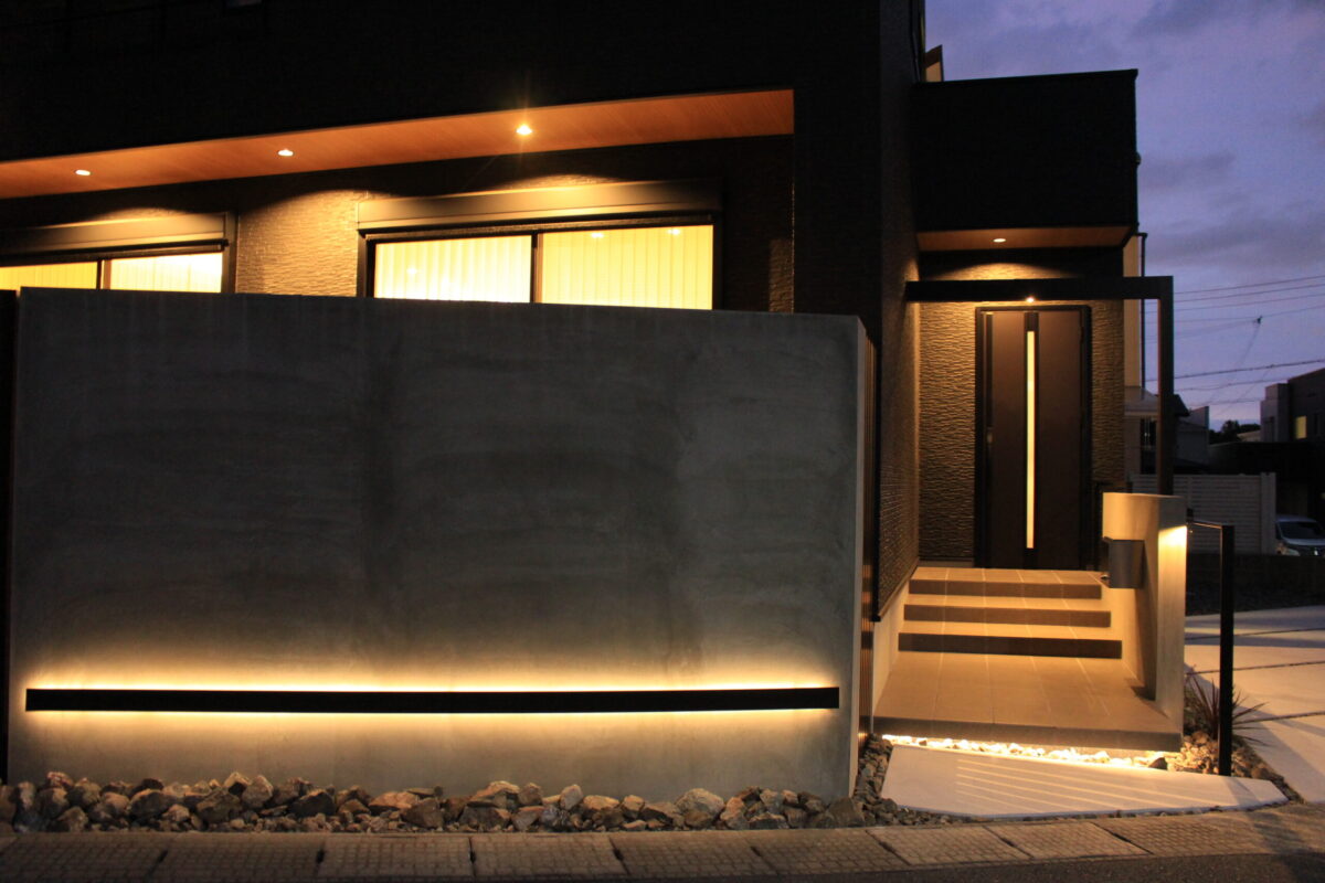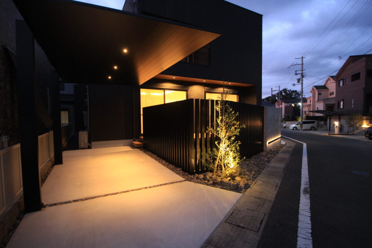 照明へのこだわりもお持ちのお客様のご要望にお応えし、門柱灯やアプローチライト、スポット照明などを適所に配置しました。夜になると、やさしい光が植栽や門袖を照らし、外構全体が美しく浮かび上がります。家族を迎える温もりある演出だけでなく、通行人の目にも美しく映る、まさに「町に灯る上質なエクステリア」となりました