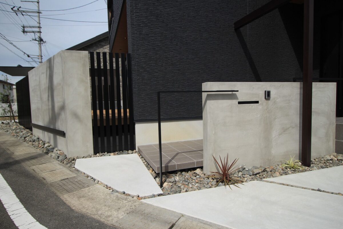 建物の外壁がブラック系だったため、色調の調和を意識し、門まわりにはグレー系モルタル仕上げの門袖を設置。異なる色味でありながら、素材感とトーンを揃えることで全体の統一感を演出し、落ち着きのあるファサードを形にしました。