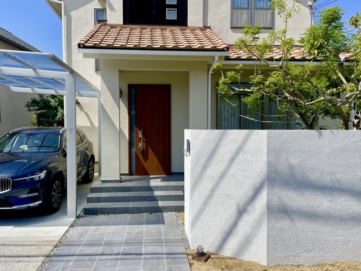 また、玄関アプローチのタイルがお好みでなかったため、玄関ポーチのタイルをはりかえ、それに似合ったアプローチを提案しました。