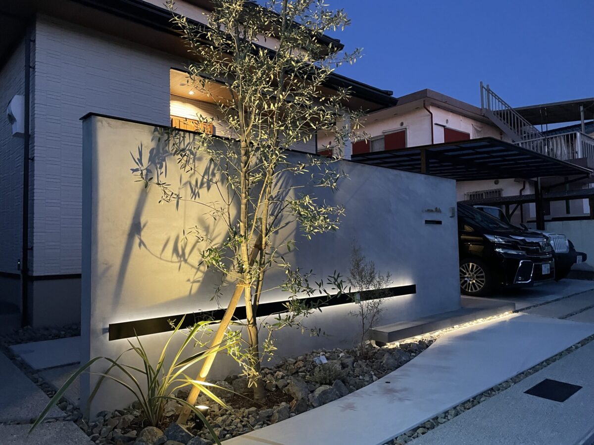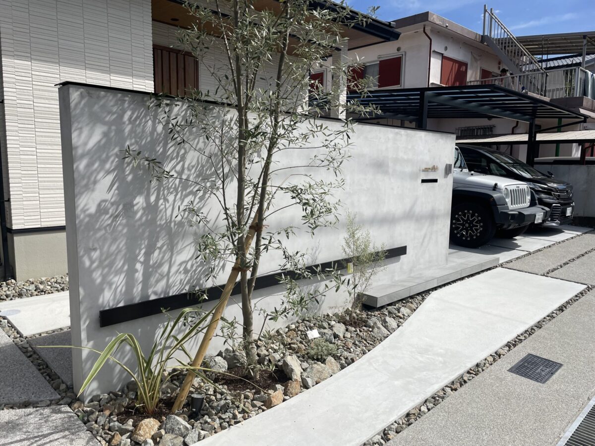 さらに、門柱のそばには4mを超えるオリーブの木をシンボルツリーとして配置しました