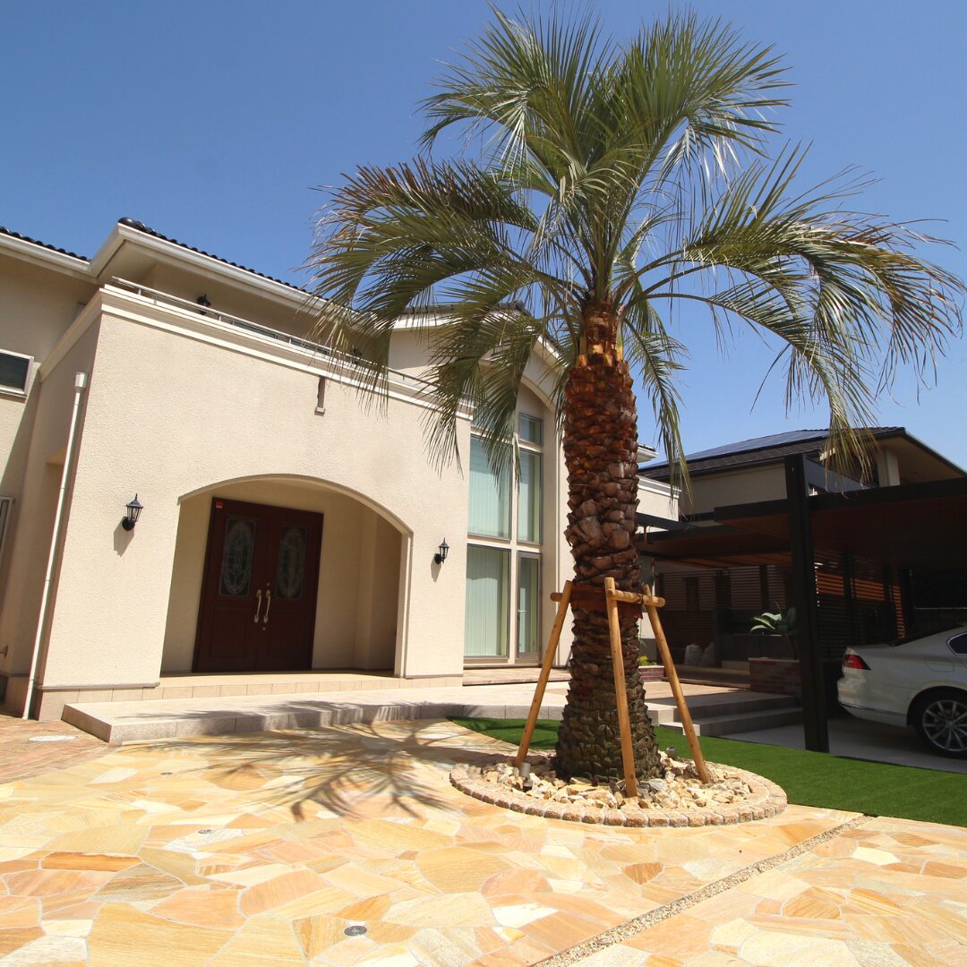このライフスタイルを実現するために、私たちは植栽選びにもこだわりました。管理の手間が少ないヤシやユッカなどの植栽を採用し、特にシンボルツリーとして家の屋根に届きそうなほどの高さを誇るヤシの木を植えました。これにより、お住まい全体にリゾート感が漂い、訪れる人の目を惹く象徴的な存在となっています。
