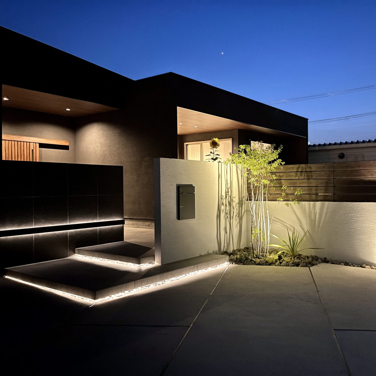 階段の蹴込部分には間接照明を仕込み、夜間でも安全に昇り・降りできるように配慮するとともに、エクステリアとしての意匠性を高めました。