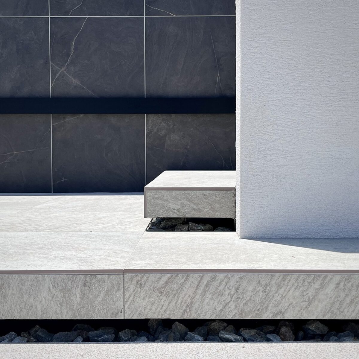 タイルの質感とカラーがファサード全体を引き締め、シンプルながらも重厚感ある印象を与えています。